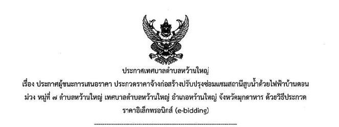 ประกาศผูชนะการเสนอราคาประกวดราคาจ้างปรับปรุงซ่อมแซมสถานีสูบน้ำด้วยไฟฟ้าบ้านดอนม่วง หมู่ที่ 7