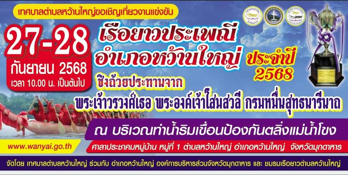 เทศบาลตำบลหว้านใหญ่ อำเภอหว้านใหญ่ และชมรมเรือยาวอำเภอหว้านใหญ่ ร่วมบูรณาการกับองค์การบริหารส่วนจังหวัดมุกดาหาร ขอเชิญชวนทุกท่านเที่ยวชมการแข่งขันเรือยาวประเพณีอำเภอหว้านใหญ่ ชิงถ้วยประทานจาก พระเจ้าวรวงศ์เธอ พระองค์เจ้าโสมสวลี กรมหมื่นสุทธนารีนาถ ระหว่างวันที่ 27 - 28 กันยายน 2568 ณ บริเวณท่าน้ำริมเขื่อนป้องกันตลิ่งแม่น้ำโขง ศาลาประชาคมหมู่บ้าน หมู่ที่ 1 บ้านหว้านใหญ่ ตำบลหว้านใหญ่ อำเภอหว้านใหญ่ จังหวัดมุกดาหาร กำหนดให้มีการแข่งขัน เรือยาว 3 ประเภทได้แก่ เรือยาวขนาดจิ๋ว 12 ฝีพาย เรือยาวขนาดกลาง 40 ฝีพาย และเรือยาวขนาดใหญ่ 55 ฝีพาย นอกนี้ยังมีกิจกรรมอื่นๆ ที่น่าสนใจอีกมากมาย อาทิเช่น รำวง มวย และการจำหน่ายสินค้าผลิตภัณฑ์ของท้องถิ่น จึงขอเชิญชวน นักท่องเที่ยว และผู้ที่สนใจเข้าเที่ยวงานแข่งขันเรือยาวประเพณีอำเภอหว้านใหญ่